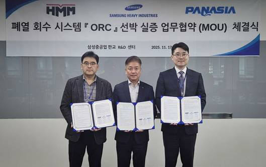 엔진에서 버려지던 열로 전기를 만들어 연료와 탄소 배출을 동시에 줄이는 기술이 HMM 선박에 시험 적용된다. HMM은 삼성중공업과 국내 친환경 설비 전문기업 파나시아와 '유기랭킹사이클(ORC) 폐열회수발전시스템 선박 실증 업무협약(MOU)'을 체결했다고 18일 밝혔다. 삼성중공업 판교R&D센터에서 17일 진행된 협약식에는 HMM, 삼성중공업, 파나시아 임직원 20여 명이 참석했다. 폐열회수발전시스템은 선박 엔진에서 발생하는 폐열을 활용해 선박 운항에 필요한 전력을 생산하는 기술이다. 기존 증기를 이용한 폐열회수발전시스템은 고온의 폐열을 이용했는데, ORC 시스템은 물보다 끓는 점이 낮은 온도에서 기화되는 유기 열매체를 사용해 중저온의 폐열로도 전력 생산이 가능하다. 폐열회수발전시스템을 활용해 전력을 생산하면 그만큼 발전기 사용이 줄어들어 탄소 배출을 저감할 수 있다. LNG, 메탄올 등 친환경 연료를 사용하는 선박의 경우, 높은 연료 단가를 감안하면 운항비 절감 효과도 기대된다. 국내 최초로 진행되는 해상 실증을 통해 3사는 ▲ORC 폐열회수발전시스템의 효과 검증 ▲기술적·경제적 타당성 검토 ▲실증 운항 데이터 확보를 목표로 하고, 연간 230톤의 연료와 700톤 탄소 배출 저감 효과를 기대하고 있다. 이번 협약에 따라 3사는 공동 워킹그룹을 구성하고, HMM이 운항 중인 1만6천 TEU급 컨테이너선에 삼성중공업에서 개발한 250KW급 ORC 폐열회수발전시스템을 탑재해 해상 실증을 진행할 계획이다. HMM은 지난 2023년 발주한 9천 TEU급 메탄올 이중연료 컨테이너선 9척을 올해부터 내년까지 순차적으로 시장에 투입하고 있으며, 10월에는 1만3천 TEU급 LNG 이중연료 컨테이너선 12척 도입을 결정하는 등 친환경 연료 선박을 적극적으로 도입하고 있다. HMM 관계자는 “2050 탄소중립을 위한 글로벌 변화에 맞춰 HMM은 이보다 5년 빠른 '2045 넷제로' 조기 달성 목표를 세웠다”며, “이를 위해 친환경 연료 선박 확보는 물론, 다양한 기술 개발과 도입을 적극 추진하고 있다”고 밝혔다.