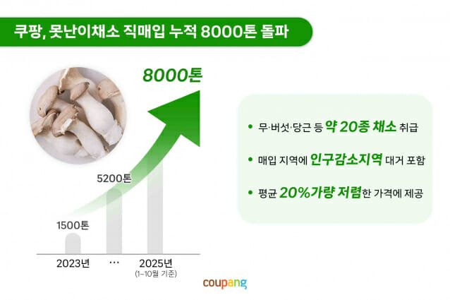쿠팡이 최근 3년간 전국 농가에서 직매입해 새벽배송으로 선보인 '못난이 채소' 누적 규모가 8천톤을 돌파했다고 18일 밝혔다. 기후피해와 경기침체로 어려움을 겪는 농가에 안정적 판로를 제공하고, 소비자에게는 신선한 채소를 합리적 가격에 공급해 장바구니 물가 안정에 힘을 보태고 있다. 쿠팡은 못난이 채소를 본격적으로 매입하기 시작한 첫해인 2023년 1천500톤, 2024년 3천700톤, 2025년(1~10월) 2천800톤 이상을 전국 지역 농가에서 직접 매입했다. 매입 물량을 매년 꾸준히 늘린 결과, 최근 3년간 누적 규모는 8천톤을 넘어섰다. 현재 전국 각지의 농가와 협력해 무·버섯·당근·파프리카·애호박·오이 등 약 20종의 채소를 취급 중이다. 8천톤을 매입한 지역은 강원 평창·정선·태백·홍천, 충북 괴산, 충남 논산·부여, 전북 고창, 전남 해남·함평·화순, 경북 상주·의성 등 인구가 줄어들고 있는 인구감소지역이 대거 포함됐다. 쿠팡은 이를 포함해 제주까지 전국 수백개 농가의 못난이 채소를 매입해 지역 경제 활성화에 기여하고 있다. 못난이 채소는 외형이 규격에 맞지 않아 일반 유통에서 제외되지만, 신선도와 맛에는 차이가 없다. 쿠팡은 이러한 채소를 직매입해 평균 20%가량 저렴한 가격에 제공해 고물가 시대 합리적 소비를 원하는 고객들로부터 큰 호응을 얻고 있다. 올해도 폭염 등 이상기후로 전국 곳곳 농가가 피해를 입었지만, 쿠팡의 대규모 직매입으로 폐기될 채소가 농가의 수익으로 전환되는 구조가 만들어졌다. 농가들은 “쿠팡과의 거래가 안정적인 농가 경영에 큰 힘이 된다”고 입을 모았다. 경기 용인의 '군자농원' 측은 “버섯 작황이 나쁠 땐 판로가 없어 헐값에 넘겨야 했지만, 쿠팡 덕분에 올해 10월까지 못난이 표고버섯이 쿠팡 납품량의 30%를 차지했다”며 “물류비 절감으로 고용도 지난해보다 20% 이상 늘었다”고 말했다. 충남 당진의 '그린팜 영농조합' 정칠화 대표는 “쿠팡의 대규모 매입으로 판매가 어려웠던 못난이 무가 효자 상품으로 자리 잡았다”며 “든든한 판로가 되어준 쿠팡 덕분에 매출이 늘고 농가 경영이 안정됐다”고 밝혔다. 쿠팡은 복잡한 중간 유통 단계를 없애고, 산지에서 직매입한 채소를 자체 물류센터에서 검수·포장 후 로켓프레시 새벽배송으로 고객에게 전달한다. 산지 직거래 구조를 통해 농가의 물류비 부담을 줄이고, 소비자에게는 신선한 농산물을 더 저렴하고 빠르게 제공한다. 오전 7시까지 집 앞에 도착하는 새벽배송은 워킹맘을 비롯한 주부들이 아침 식탁을 준비하는 데 큰 도움을 준다. 특히 못난이 채소는 가성비와 품질을 중시하는 고객들에게 인기를 얻고 있다. 신선물류센터에서 바로 출고된 상품이 새벽배송으로 전달돼, 고객은 신선함과 맛을 그대로 유지한 채 받아 볼 수 있다. 쿠팡의 못난이 채소 활성화 정책은 고객 인지도가 낮은 다양한 농가 채소들이 새롭게 조명받는 기회로 자리매김했다. 경기 이천의 '송이애' 버섯농가 김성수 상무는 “외면받던 못난이 새송이버섯에 대한 고객 인식이 쿠팡 덕분에 긍정적으로 바뀌었고, 전체 납품 버섯 물량 가운데 못난이 비중이 20%에 달한다”며 “모양은 달라도 맛과 품질은 같다는 점을 이해해주는 소비자 덕분에 폐기 비용이 줄고 수익으로 전환됐다”고 말했다. 더불어민주당 신정훈 국회의원(나주·화순)은 "쿠팡의 못난이 채소 매입은 인구감소지역이 많은 전남 농가의 물류비 부담를 줄여 지역 경제 활성화에 실질적으로 기여하는 모범 사례"라며 "쿠팡의 물류·기술 역량이 농가 지원의 기반이 되어 선순환 구조를 만든 만큼, 앞으로도 전남을 포함한 산간·농촌 중심으로 협력 농가 확대가 활발히 추진되길 기대한다”고 말했다. 쿠팡은 향후 산간 및 농촌 지역 중심으로 협력 농가를 확대할 계획이다. 쿠팡 관계자는 “쿠팡의 물류와 기술 역량이 농가 지원의 기반이 되고 있다”며 “앞으로도 지역 농가의 안정적인 판로를 넓히고, 고객에게는 신선하고 합리적인 먹거리를 제공하는 선순환 구조를 지속적으로 만들어가겠다”고 밝혔다.
