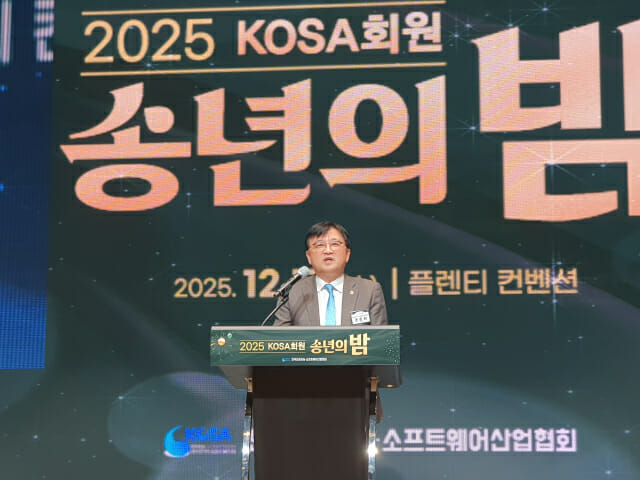 한국 인공지능·소프트웨어(AI·SW) 산업계가 한 해를 마무리하며 성과를 공유하고 내년 도약을 다짐하는 자리가 마련됐다. 산업계와 정부, 국회가 한자리에 모여 AI 대전환 시대의 정책 방향과 산업 전략을 논의하는 동시에 산업 발전에 기여한 기업과 인물들의 노고를 치하했다. 조준희 한국인공지능·소프트웨어산업협회(KOSA)장은 17일 서울 서초구 플렌티 컨벤션에서 열린 '2025 KOSA 회원 송년의 밤'에서 "AI·SW 기업들이 협력과 연대를 통해 글로벌 시장에 내놓을 수 있는 최소 3개의 수출형 풀스택 AI 제품을 만들어야 할 시점"이라고 강조했다. 조 회장은 "올해 협회를 운영하며 가장 크게 느낀 점은 AI 시대로의 전환이 얼마나 급박하게 진행되고 있는가 하는 점이었다"며 "정부와 산업계가 함께 그래픽처리장치(GPU) 확보에 총력을 기울였고 AI 컴퓨팅 센터 역시 SPC 형태로 설립을 추진하며 의미 있는 진전을 이뤘다"고 회고했다. 이어 "국민 누구나 정보 비대칭 없이 활용할 수 있는 독자 파운데이션 모델 확보를 위해 5개 기업을 선정해 집중 지원하고 있으며 특화 파운데이션 모델 역시 버티컬 중심으로 지속적으로 육성하고 있다"며 "제조·IoT·로봇·휴머노이드 등 다양한 산업과 연계된 피지컬 AI 생태계도 빠르게 성장하고 있다"고 말하면서 한국 AI·SW 산업 성장의 기대감을 드러냈다. 정부를 대표해 참석한 과학기술정보통신부 남철기 소프트웨어정책국장은 축사를 통해 "이제 SW 산업은 우리 경제의 핵심 축으로 확고히 자리 잡았다"며 "산업 부가가치 비중은 1.3%를 넘어섰고 매출 1천억원 이상을 기록한 SW 기업도 127개에 이르는 등 괄목할 만한 성장을 이어가고 있다"고 말했다. 또 그는 "AI 시대에 접어들면서 매년 새로운 AI 서비스와 기술이 등장하고 있다"며 "변화의 속도가 매우 빠르고 때로는 버겁게 느껴질 수도 있지만 이러한 도전은 반드시 우리 SW 산업이 감당하고 넘어가야 할 과제"라고 강조했다. 이어 "내년에는 약 10조원 규모의 AI 예산 투자가 이뤄질 예정이며 AI 인프라 확충과 AI 모델 개발, 고성능 GPU 확보에 대한 투자가 대폭 확대될 것"이라고 덧붙였다. 이날 행사에서는 '2025 KOSA 10대 성과'도 발표됐다. 협회는 올해 협회 명칭을 '한국인공지능·소프트웨어산업협회'로 변경하며 AI·SW 산업을 함께 대표하는 단체로서의 역할과 위상을 명확히 했다. 이와 함께 ▲AI 정책 싱크탱크 역할 강화 ▲산업 현장 중심의 피지컬 AI 생태계 조성 ▲대선 정책 제안 활동을 통한 정책 반영 ▲AX 활성화를 위한 수요·공급 연계 기반 마련 ▲AI 스타트업 지원 체계 구축 ▲소버린 AI 수출 및 글로벌 진출 가속화 ▲AI 페스타 개최 ▲실무형 AI 인재 양성 ▲AI·SW 산업 특화 ESG 경영 진단 고도화 등이 주요 성과로 소개됐다. 시상식에서는 한 해 동안 AI·SW 산업 발전에 기여한 기업과 기관, 인물들에 대한 시상이 진행됐다. 'AI·SW 의정대상'은 더불어민주당 조인철·황정아 의원, 국민의힘 신성범·최형두 의원, 조국혁신당 이해민 의원에게 수여됐다. 국회 과학기술정보방송통신위원회 소속 최형두 국민의힘 의원은 영상 축사를 통해 "이번 수상은 개인의 영광이라기보다 산업 현장과 국회가 같은 방향을 바라보며 함께 뛰어온 결과라고 생각한다"며 "KOSA와 회원사 여러분께서 전해주신 현장의 목소리, 그리고 기술과 산업의 미래를 위해 묵묵히 헌신해 오신 여러분의 노력이 있었기에 제가 이 상을 대신 받게 됐다"고 소감을 전했다. 이어 "AI·SW는 이제 대한민국 경제의 속도를 바꾸는 핵심 기반이 됐다"며 "현장의 도전과 혁신이 위축되지 않도록 불필요한 규제는 과감히 걷어내고 국민의 권익과 사회적 신뢰를 지키는 원칙은 더욱 단단히 세울 것"이라고 덧붙였다. '제2회 AI·SW기업 ESG 경영 대상'에서는 대상(부총리 겸 과기정통부 장관상)에 한화시스템·시스원·포티투마루가 선정됐다. 최우수상(KOSA 협회장상)은 메가존클라우드·아이티센글로벌·와이즈와이어즈·와이즈스톤이 받았으며 특별상은 이수시스템·아이에스·지란지교소프트·시프트바이오가 수상했다. '제24회 대한민국 AI·SW기업 경쟁력 대상'에서는 오케스트로·와이즈넛·라온시큐어가 대상을 차지했다. 최우수상에는 인텔리빅스·티디지·비젠트로·데이터스트림즈·비엠텍시스템·티맥스티베로·GS ITM·이노그리드·파수·비앤에프테크놀로지가 이름을 올렸다. 우수상은 사이냅소프트·위버스브레인·플랜티넷·메인라인·바이텍씨스템이 받았다. 루키상은 씨앤이 수상했다. 이 밖에 'AI·SW 아너스 어워드'는 KOSA 제12~13대 회장을 역임한 오경수 전 롯데정보통신 대표에게 수여됐고 'AI·SW 상생협력 대상'은 충청북도가 선정됐다. '올해의 회원상'은 랭코드·아이티센클로잇·마드라스체크·플리토·KCC정보통신·좋은정보기술·한글과컴퓨터가 수상했으며 '올해의 파트너상'은 KOTRA AI융복합팀이 받았다. 특히 '올해의 기자상'은 지디넷코리아 장유미 기자가 수상했다. 장 기자는 올 한 해 AI·SW 산업 현장을 심층 취재하며 정책 변화와 기술 흐름, 기업 생태계 전반을 심층적으로 전달해왔다. 협회는 국내 AI·SW 산업 발전을 위한 기사를 꾸준히 써오며 현장의 목소리를 사회적으로 