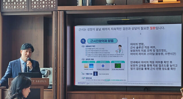 2050년 한국 청소년 대부분이 '근시'가 될 것이라는 예측이다. 이에 근시가 실명될 수 있는 질환과 연관이 있는 만큼 초기 치료에 나서 질환의 진행을 늦춰야 한다는 지적이다. 쿠퍼비전 코리아는 22일 근시 치료에 대한 국내외 최신 트렌드와 한국소아청소년 근시연구회(KMS)가 마련한 한국형 근시 가이드라인을 공유하는 '2026 쿠퍼비전 미디어 클럽'을 개최했다. 이 자리에서 서영우 고대구로병원 안과 교수는 '한국형 근시 가이드라인'을 주제로 한 발표를 통해 “원시 상태에서 태어나 아이가 성장하며 눈이 점점 커져 정시가 된다. 문제는 여기서 더 커져 근시가 되는 것”이라며 “눈이 커지면 작아질 수 없다. 근시는 아이가 성장하면서 계속 진행되기 때문에 계속 눈이 커지지 않도록 개입하는 것이 치료의 목표이다”라고 말했다. 특히 “근시를 지속적으로 이야기하는 이유는 유병률이 너무 올라가고 있기 때문이다. 2008년 자료를 보면 근시 유병률이 5-6세는 20%, 10-18세는 80%, 다시 어른이 되면 낮아지는데, 이를 어른이 되면 좋아진다고 착각할 수 있다는 것”이라며 “문제는 근시는 좋아지지 않기 때문에 80%인 10-18세가 40-50년 지나면 성인 유병률이 계속 올라간다. 이에 2050년 근시 유병률이 90%를 넘고, 고도근시도 31.26%에 달할 것으로 예측되는 상황”이라고 강조했다. 2013~2022년 서울지역 병무청 신체검사 데이터(동일 연령대 남성 청소년 전수)로 진행한 연구에 따르면 현재 유병률(조사기간 평균)은 근시 70.67%, 고도근시 20.29%이다. 그럼 근시를 치료해야 하는 이유는 무엇일까. 서영우 교수는 “안경 쓰면 되지 않냐고 하는데 문제는 시력이 아니다. 근시 진행은 단순한 시력 저하의 의미를 넘어 눈이 늘어나는 것, 안축장의 비정상적 성장으로 인한 녹내장과 망막박리, 근시성 황반변성으로 실명 위험을 내포하고 있기 때문”이라며 “우리가 해야 할 것은 근시가 안 늘어나게 하는 것이고, 치료의 목표가 된다”라고 말했다. 연구에 따르면 근시를 방치해 고도근시가 되면 일반인에 비해 합병증 위험이 백내장 최대 12.4배, 망막박리 88배, 녹내장 1.65배, 근시성 황반변성 40배 등으로 높아진다. 근시는 망막의 초점이 안 맞아 잘 볼 수 없는 것이다. 이를 개선하기 위해 각막굴절교정렌즈(드림렌즈), 근시억제안경, 소프트 콘택트렌즈 등 디포커스 줄여주는 '광학치료'와 아트로핀점안액(동공키우는) 등 '약물치료'가 있다. 서 교수는 “치료 안전성과 기술도 발전했는데, 2011년 의료진 대상 조사에서 광학치료나 약물치료에 대해 큰 이점이 없다는 답변이 높았는데, 2023년 설문에는 둘 다 사용하고 있다는 답변이 높게 나와 치료방침이 크게 바뀐 것을 볼 수 있었다”라며 “치료 방법이 많아진 만큼 어떤 것을 선택할지 의료진을 위한 가이드라인이 필요해 '한국형 근시 가이드라인'을 만들게 됐다”라고 설명했다. 이어 “가이드라인에는 일반인도 참고할 수 있는 생활습관도 담았는데, 일례로 일 야외활동을 2시간 이상 하면 근시 예방에 도움된다는 것인데 현실은 불가능하다. 반면 해외에서는 학교 정책에 야외활동 시간을 마련토록 하고 있어 우리나라도 그런 정책이 필요하다고 생각한다”고 조언했다.
