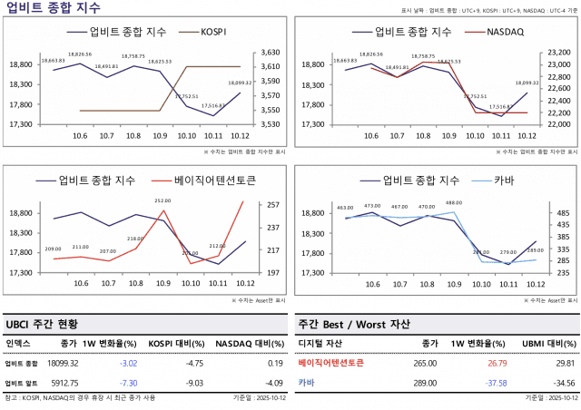 [ZD 위클리 코인] 10월 둘째 주 UBCI, 전주 대비 3.02% 하락